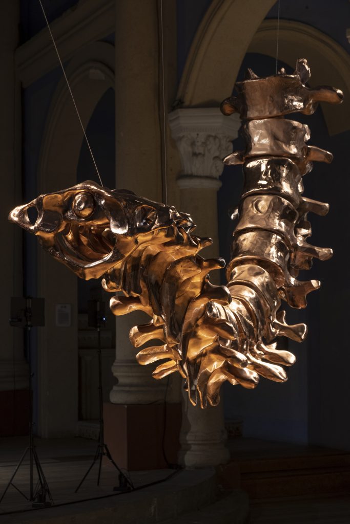 The last desire appears as a scenario of biological, geological, and technical inscription, at a threshold where bodies and minerals are reconfigured as interchangeable matter. Through a process of metallic ion transfer, the copper contained in a mineral rock migrates toward a spine of titanic scale. In the human organism, copper functions as an essential element in bone formation (osteogenesis) and, in medicine, is used for stimulating tissue regeneration. This mineral capacity to coat and regenerate bodies unfolds here as if the rock were feeding the organic form, provoking an overflowing mutation that merges the living and the inert into a single agency.