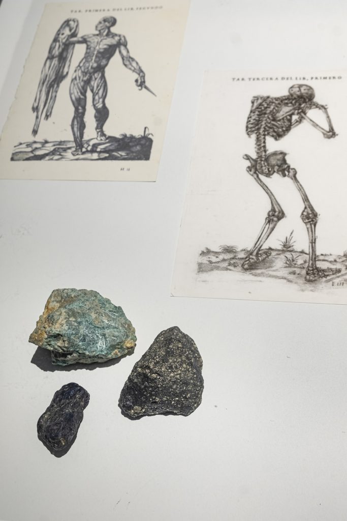 Book pages from: Juan Valverde, Historia de la composición del cuerpo humano; Andreas Vesalius, De humani corporis fabrica, 1543; Georgius Agricola, De re metallica, 1556; Athanasius Kircher, Mundus Subterraneus, 1665; D.W. Thompson, The Growth of Bone: Observations of Osteogenesis, 1917